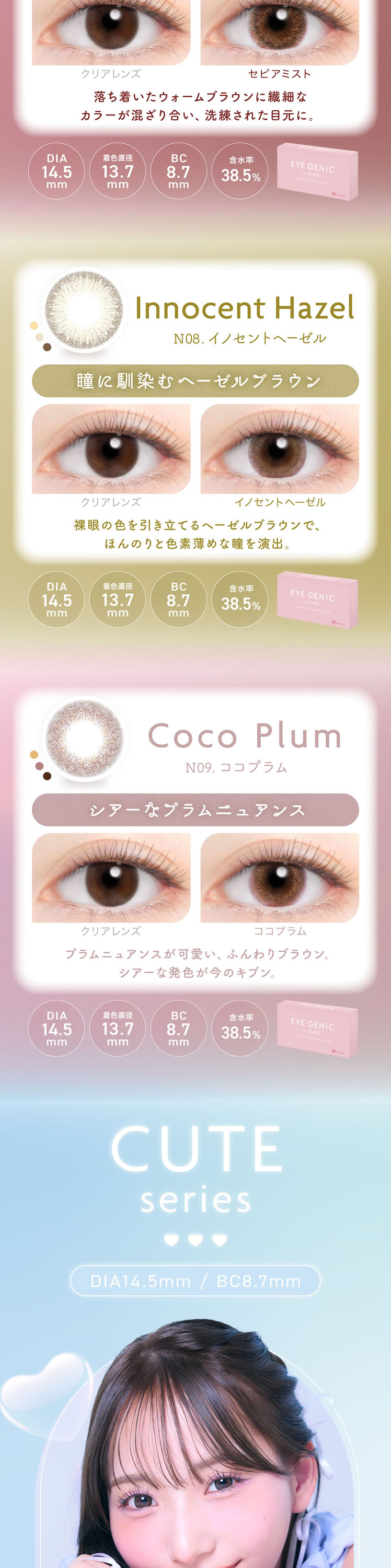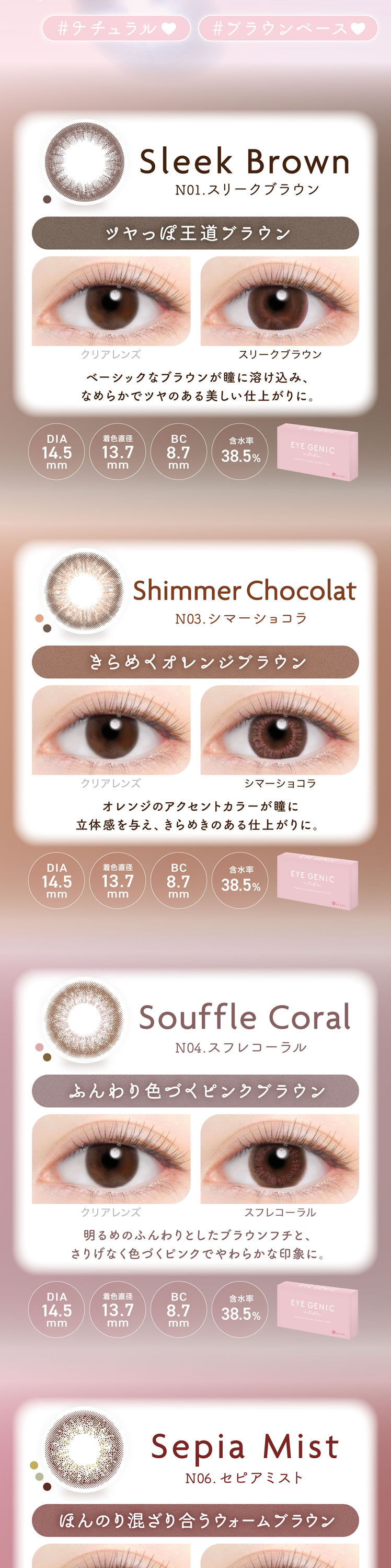 ・ナチュラルシリーズ(スリークブラウン、シマーショコラ、スフレコーラル、セピアミスト、イノセントヘーゼル、ココプラム、ピュアモア、ムーニーヌード、ディアベイビー)
