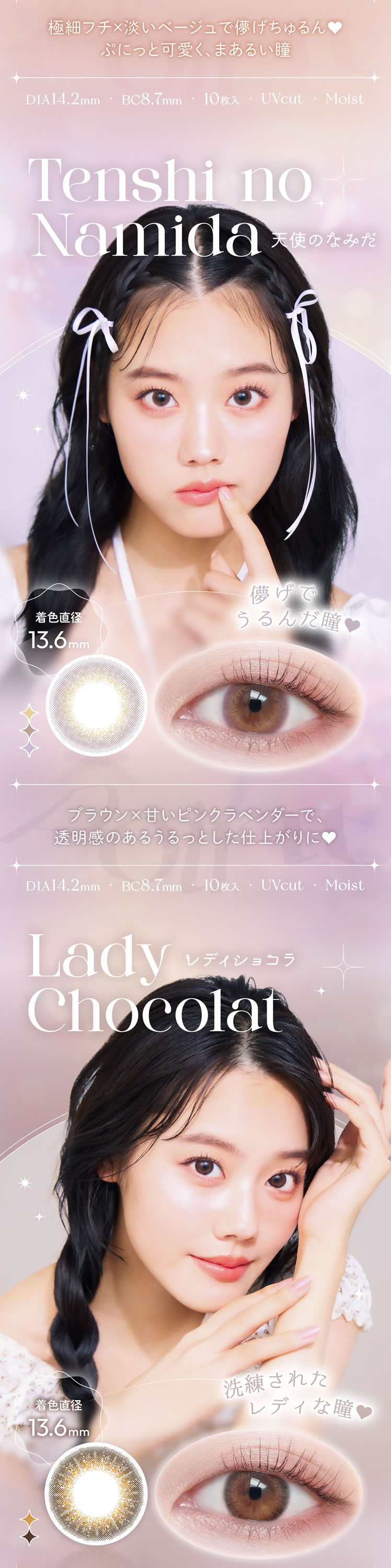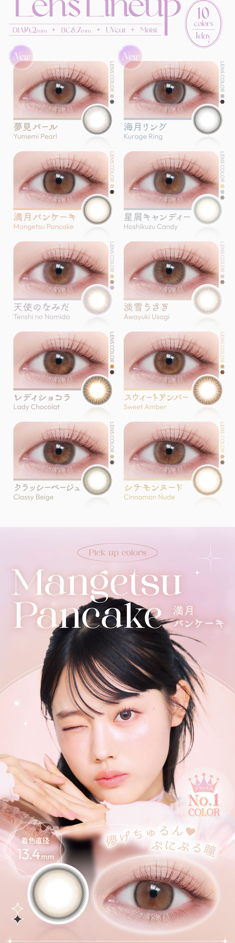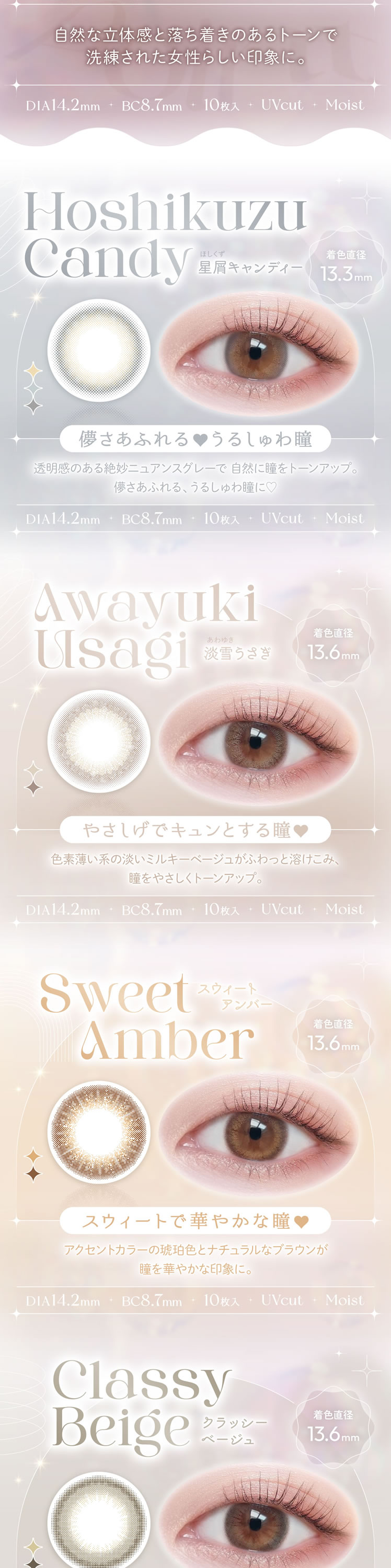 レディショコラ、スウィートアンバー、クラッシーベージュ、シナモンヌード、天使のなみだ、淡雪うさぎ、星屑キャンディ、満月パンケーキ、夢見パール、海月リング
