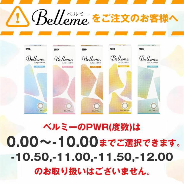 (アイコフレ)0.00(度なし)、-0.25〜-6.00(0.25D STEP)、-6.50D〜-12.00D(0.50D STEP)、+0.25、+0.50〜+3.00(0.50D STEP) (ベルミー)0.00(度なし)、-0.25~-6.00(0.25D STEP)、-6.50~-10.00(0.50D STEP)